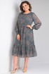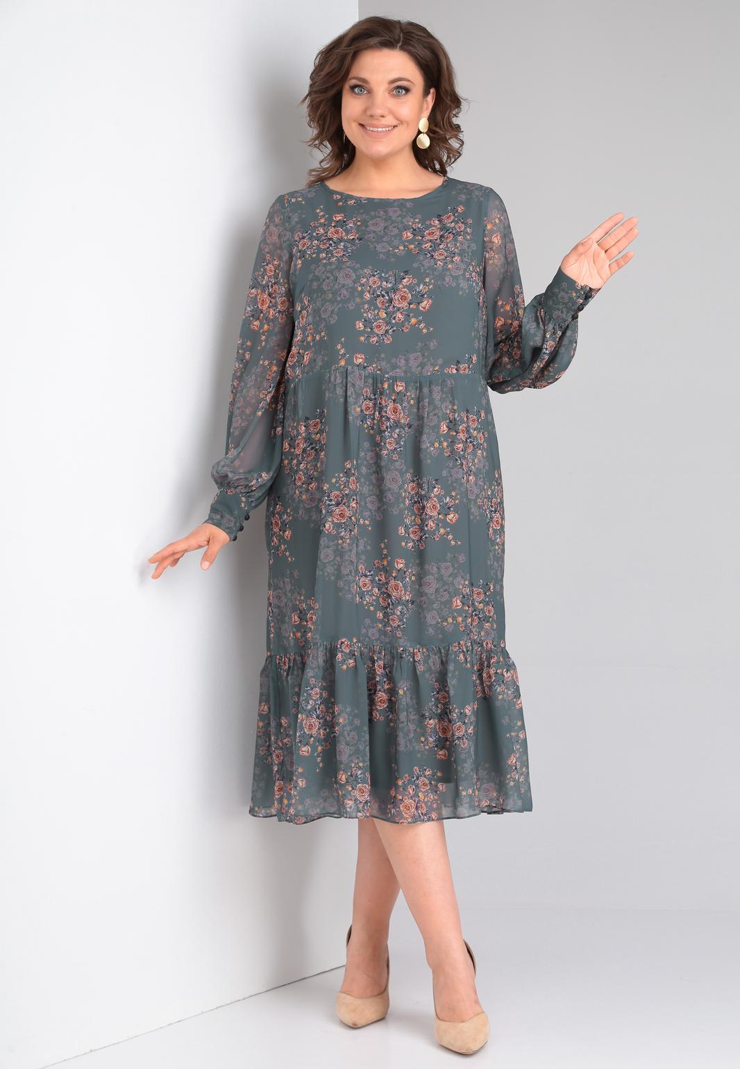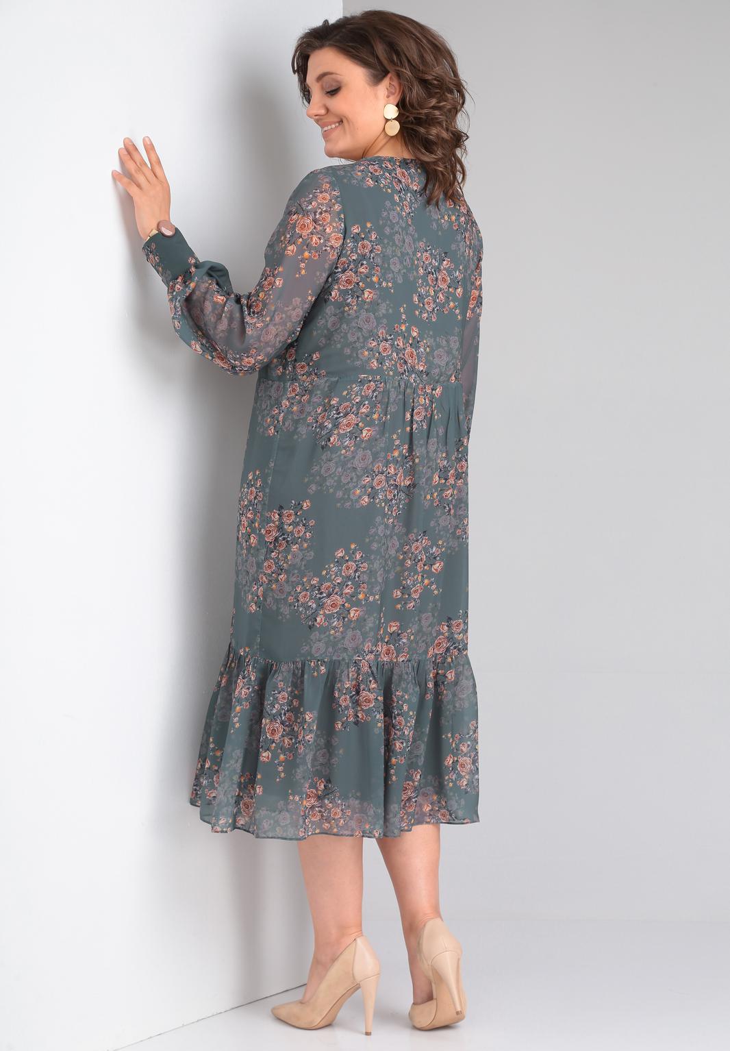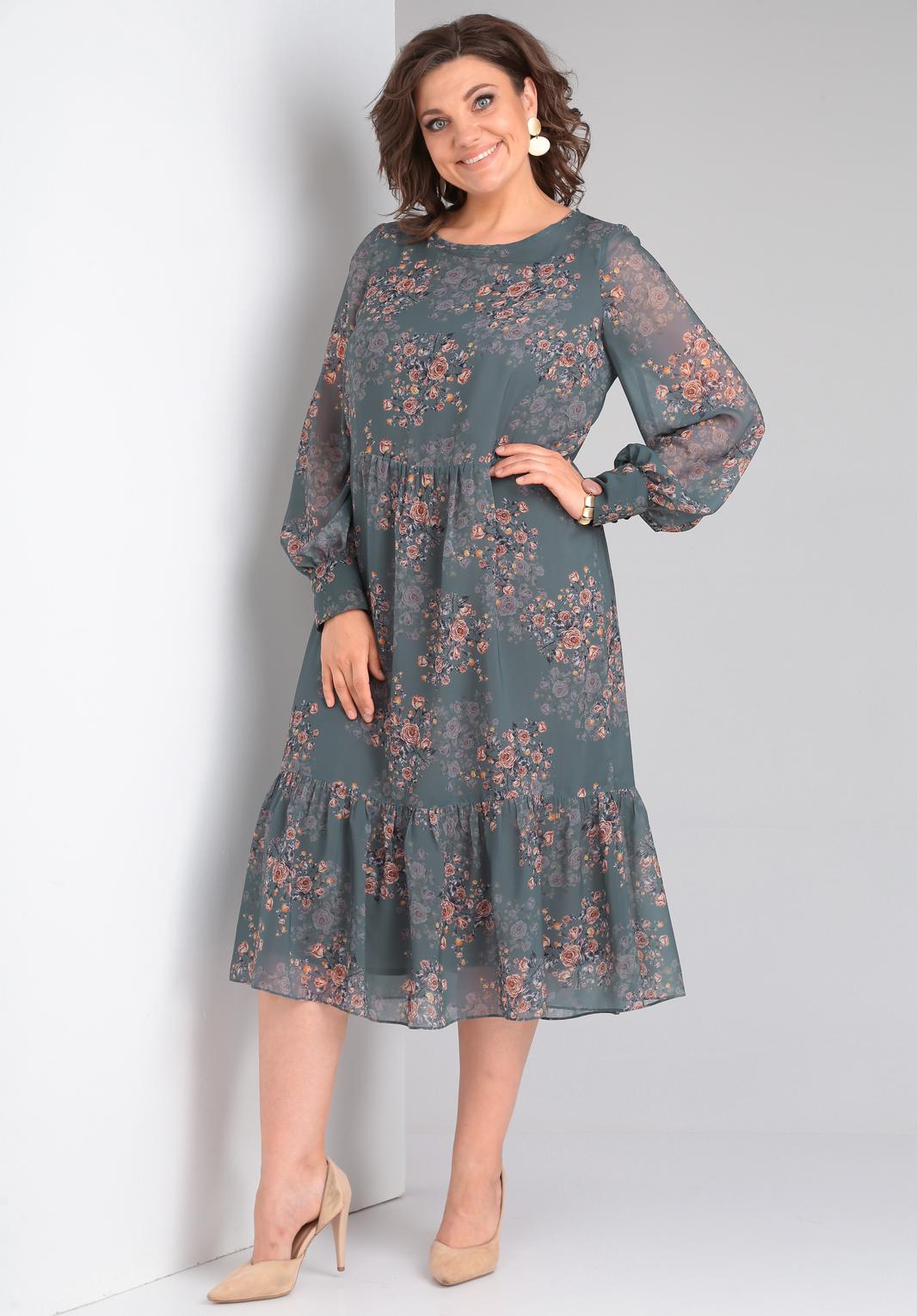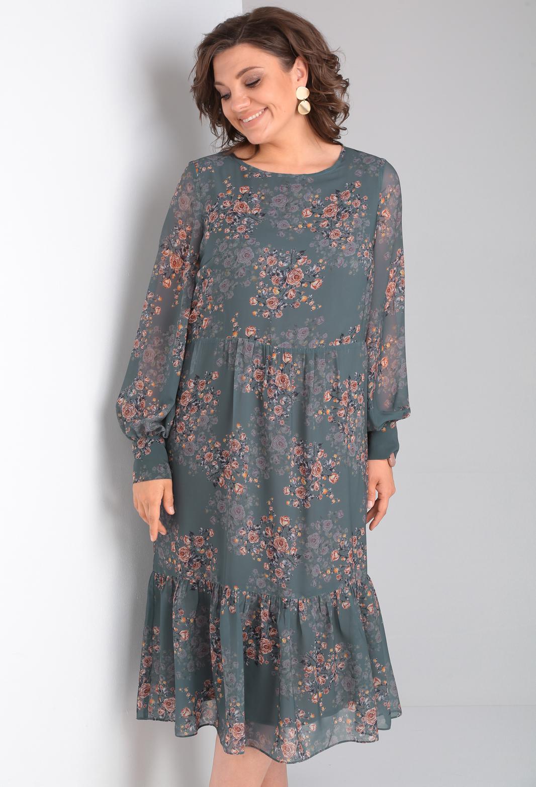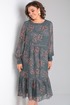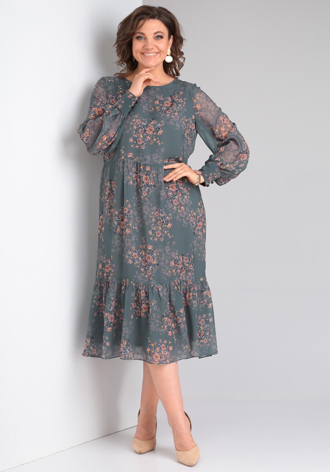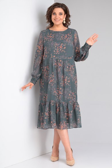 Платье шифоновое свободного силуэта, отрезное чуть выше линии талии. По низу платья идет волан со сборкой. Горловина круглая. Рукав втачной, по низу собран на широкую манжету. Длина рукава с манжетой для роста 164 см 63 см, для роста 170 см 65 см. Длина изделия от плеча по спинке для роста 164 см 114 см, для роста 170 см 117 см.
