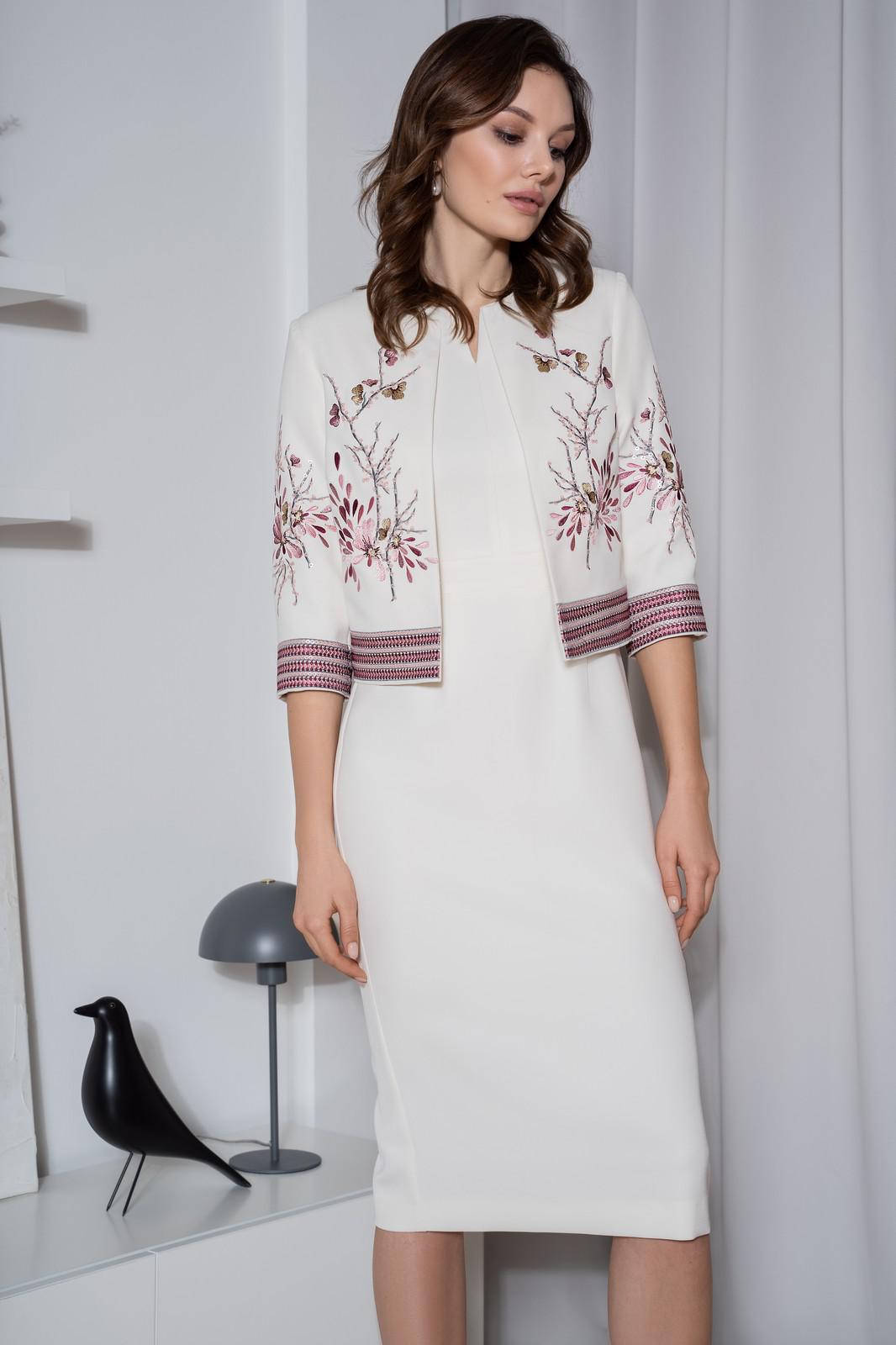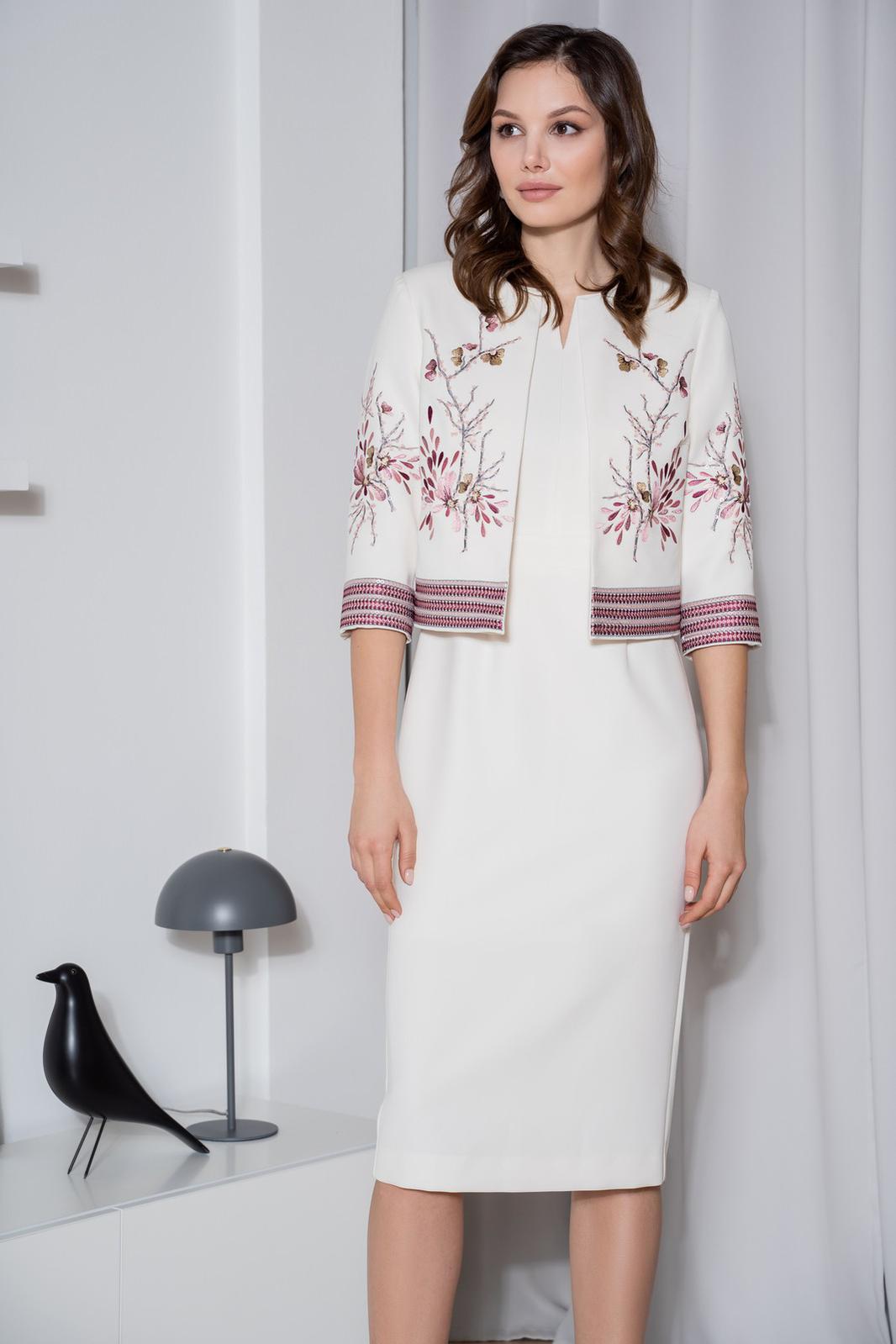 Этот изящный комплект с вышивкой, способен кардинально преобразить любую женщину, создав чувственный и очень женственный образ. Костюм женский из костюмно-плательной ткани, состоит из платья-футляр полуприлегающего силуэта с коротким рукавом и жакета полуприлегающего силуэта без застежки с художественной вышивкой.