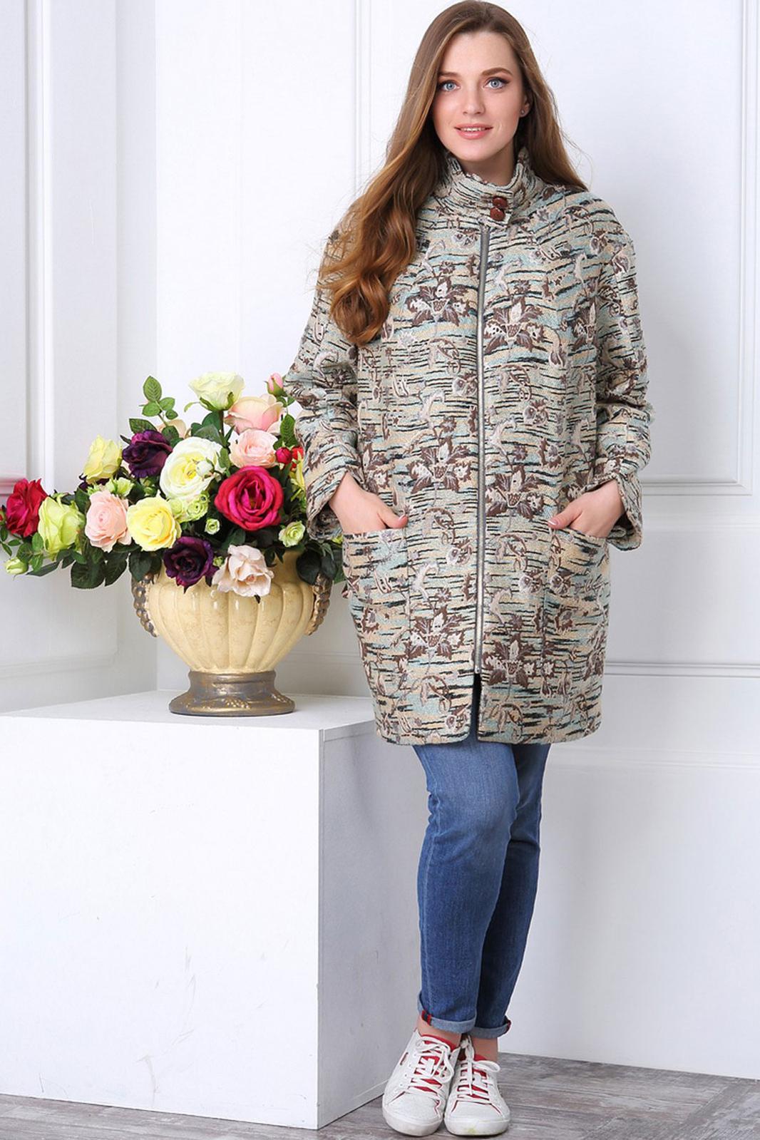Жакет прямого силуэта на подкладке и застежке « молния». Перед с нагрудными вытачками от горловины и накладными карманами. Рукав втачной двухшовный. Вырез горловины круглый. Воротник стойка с отлетными концами с застежкой на пуговицы. В боковых швах и на передней части рукава расположены разрезы со скругленными концами. Длина 85 см. Длина рукава 55 см.