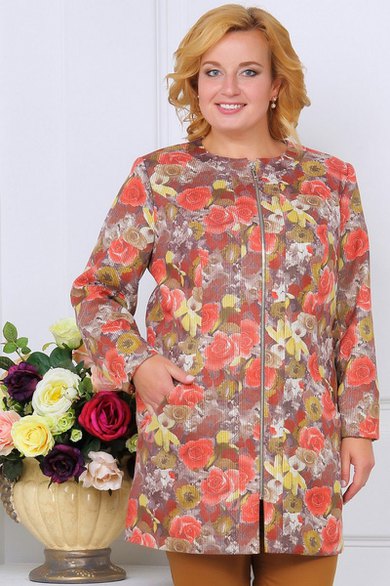 Жакет полуприлегающего силуэта на подкладке и застежке « молния». Перед с отрезными бочками и карманами, расположенными в шве притачивания бочка, притачными планкой и обтачкой. Спинка со средним швом и притачной обтачкой. Рукав втачной двухшовный. Вырез горловины круглый.Длина 83 см. Длина рукава 61 см.